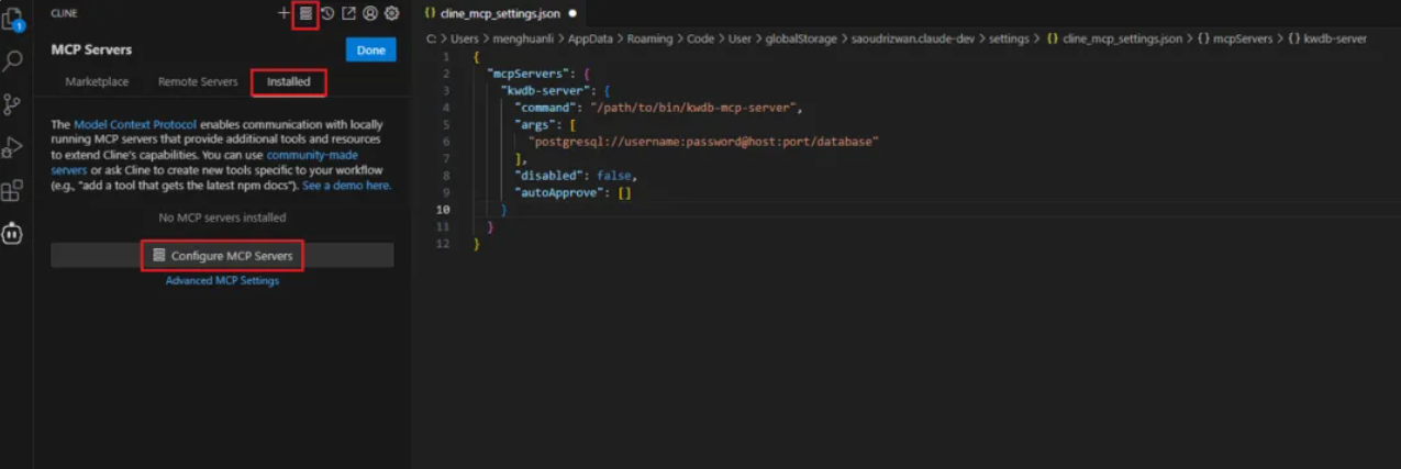 - 选择 Installed页签,单击 KWDB MCP Server 旁边的重启按钮,或者单击页面底部的 Restart Server。