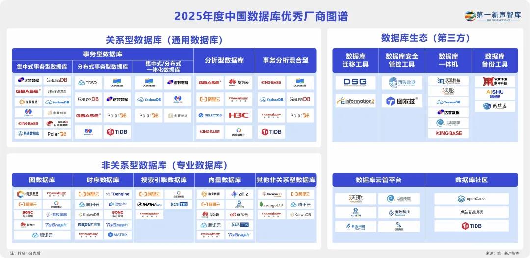 5月23日,独立研究机构第一新声智库发布**《2025年度中国数据库优秀厂商图谱》**,KaiwuDB 作为时序数据库优秀厂商代表成功入选。《图谱》信息由第一新声智库基于市场公开数据,通过调研问卷、电话访谈、分析师采访等多种方式采集;同时邀请甲方企业 CXO 高管、产业专家、一线投资机构合伙人等专家担任专家顾问,筛选出受资本市场关注、受客户认可的高科技、高成长、好口碑、稳交付、跨周期的数据库及第三方生态优秀厂商,为各行业数据库产品选型提供参考。