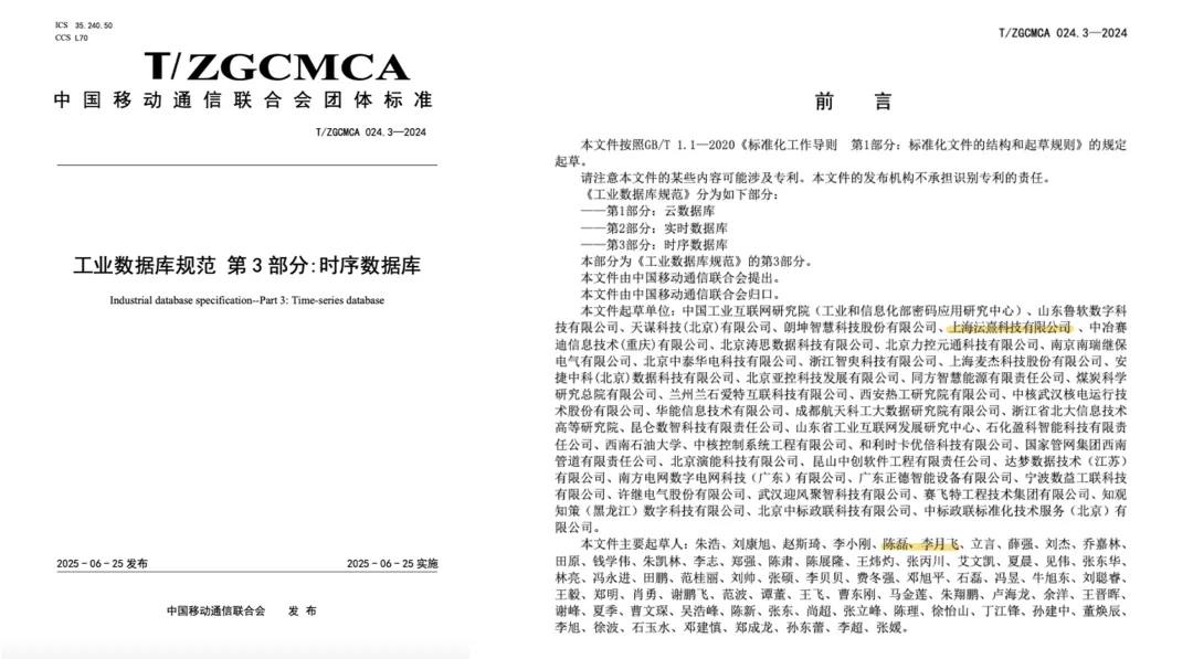6 月底,中国移动通信联合会公告显示,由中国工业互联网研究院(CAII)牵头研制的团体标准 **T/ZGCMCA 024.3—2024《工业数据库规范 第 3 部分:时序数据库》**正式发布,并于 2025 年 6 月 25 起正式实施。上海沄熹科技有限公司(浪潮KaiwuDB)担任该标准核心参编单位,浪潮 KaiwuDB 副总经理陈磊、产品总监李月飞任标准主要起草人。