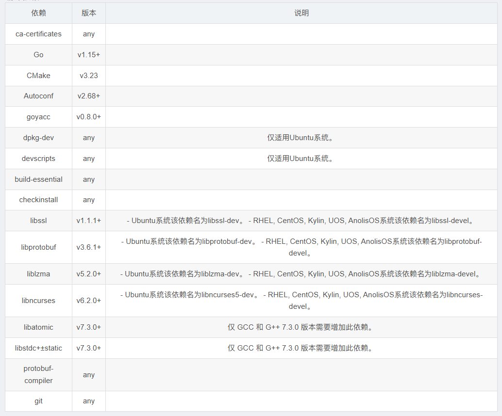 KWDB 支持在 Linux 操作系统进行安装部署,下表列出了编译和运行 KWDB 所需的软件依赖。