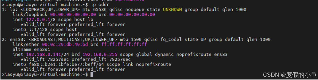 • 使用ip addr命令查看网络接口的配置信息,如 IP 地址、子网掩码、MAC 地址等