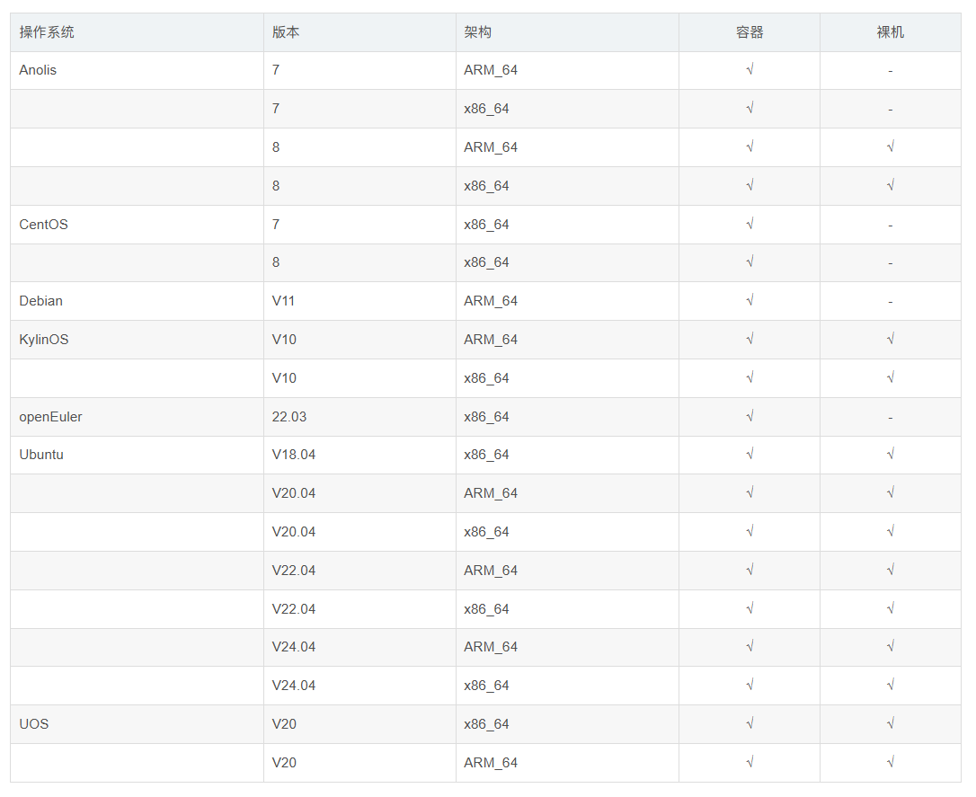 • 操作系统:支持 Ubuntu 20.04/22.04 LTS 版本、CentOS 7.x/8.x 版本、龙蜥(Anolis OS)8.x 版本。