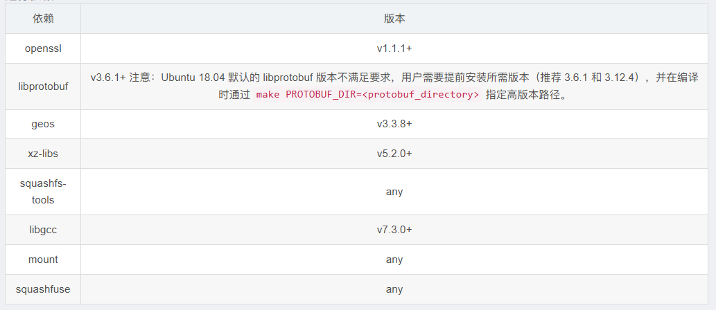 • 软件依赖:在 Ubuntu 系统上,需要安装 dpkg - dev、devscripts、liblzma - dev、libstdc++ - static 等依赖。此外,若使用 GCC 和 G++ 7.3.0 版本,还需增加 libstdc++ - static 依赖;对于 Ubuntu 18.04 系统,由于默认的 libprotobuf 版本不满足要求,用户需要提前安装 3.6.1 或 3.12.4 等所需版本,并在编译时通过 make PROTOBUF_DIR= 指定高版本路径。