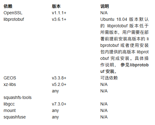 下表列出需要在目标机器安装的依赖: