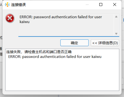 5.1、错误代码:ERROR: password authentication failed for user kaiwu