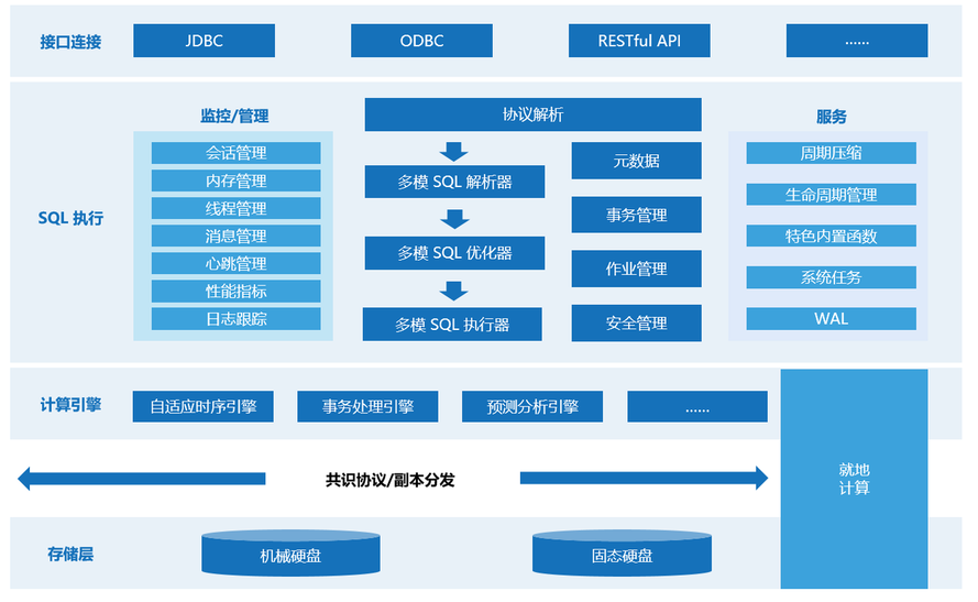 内置分布式事务管理,保证ACID特性。 时序数据优化 专为物联网场景设计,支持时间分区、降采样、数据自动压缩(压缩率可达10:1)。