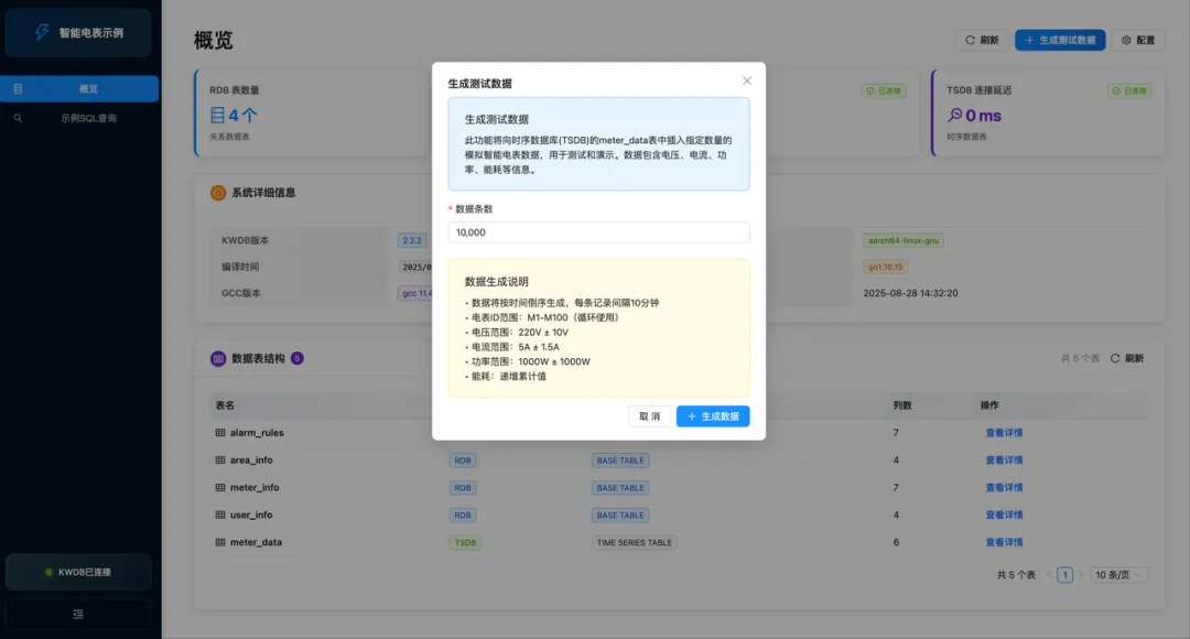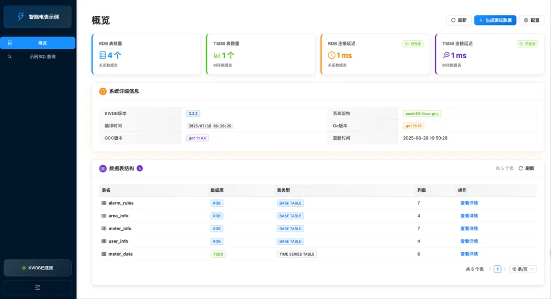 Smart Meter 项目:它模拟了 KWDB 在智能电表场景下的典型应用,包含了完整的数据表结构(关系型与时序型)和海量模拟数据。