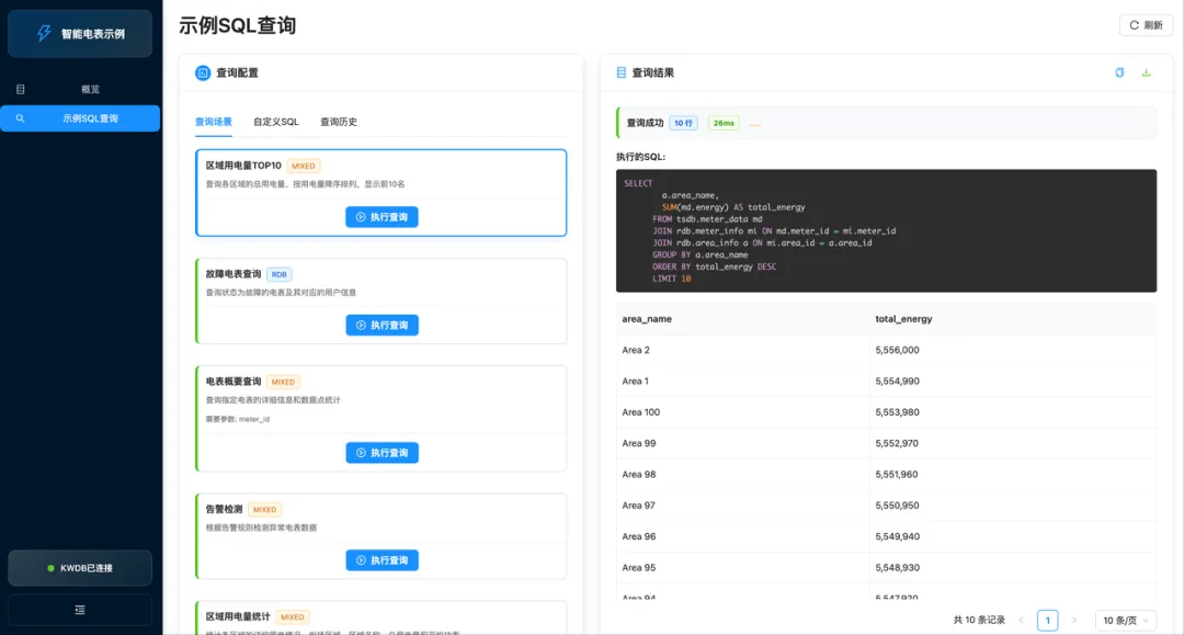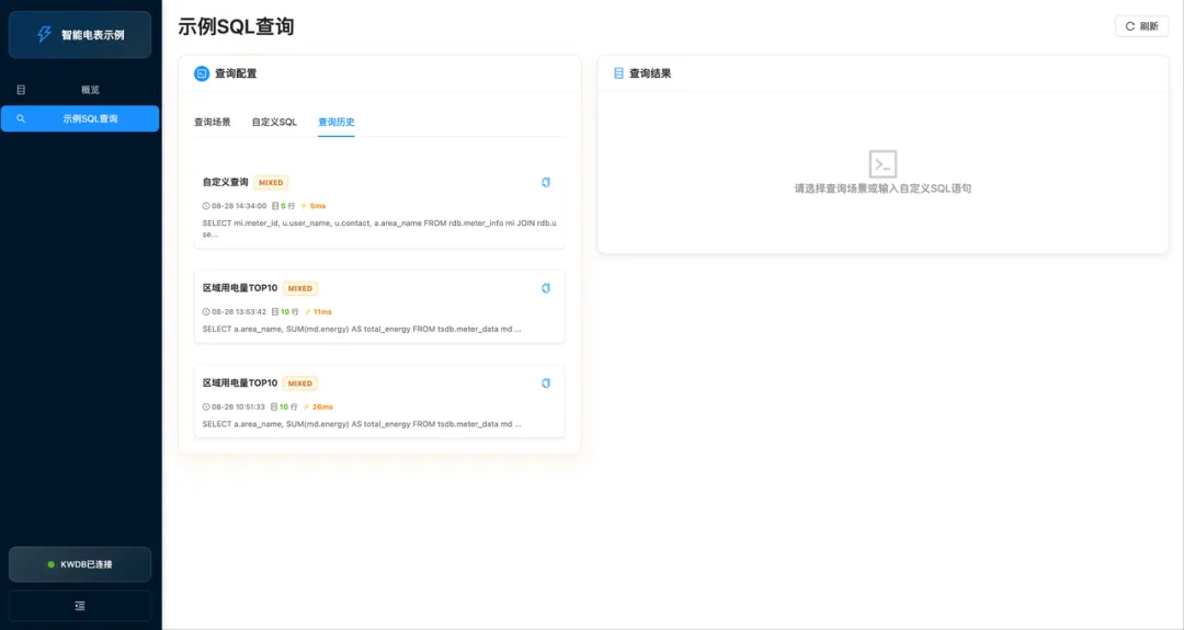 查询示例:示例 SQL 查询页面内置了丰富的查询场景示例,涵盖了 Smart Meter 项目中的所有查询场景。每个示例都以卡片形式呈现,并清晰标记了查询类型:MIXED(跨模查询)、RDB(关系型查询)和 TSDB(时序查询)。用户只需点击卡片上的"执行查询"按钮,即可实时查看对应的 SQL 执行结果。