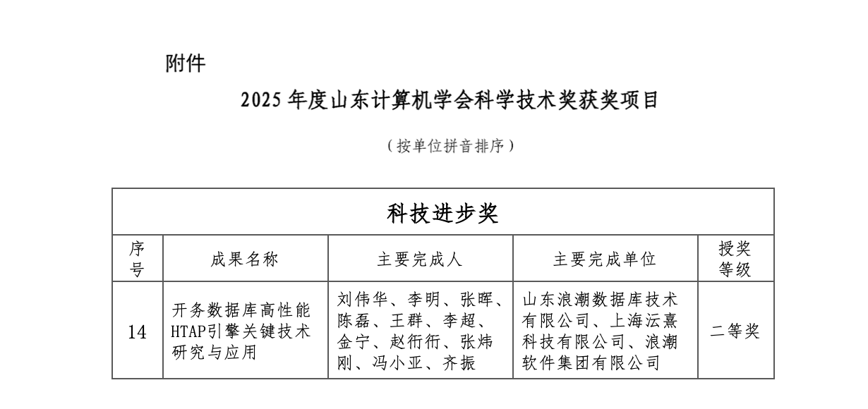 9 月 18 日,2025 年度“山东计算机学会科学技术奖”获奖名单公布,由 KaiwuDB 与浪潮软件集团联合申报的“开务数据库(KaiwuDB) 高性能 HTAP 引擎关键技术研究与应用”项目,荣获科技进步奖二等奖。