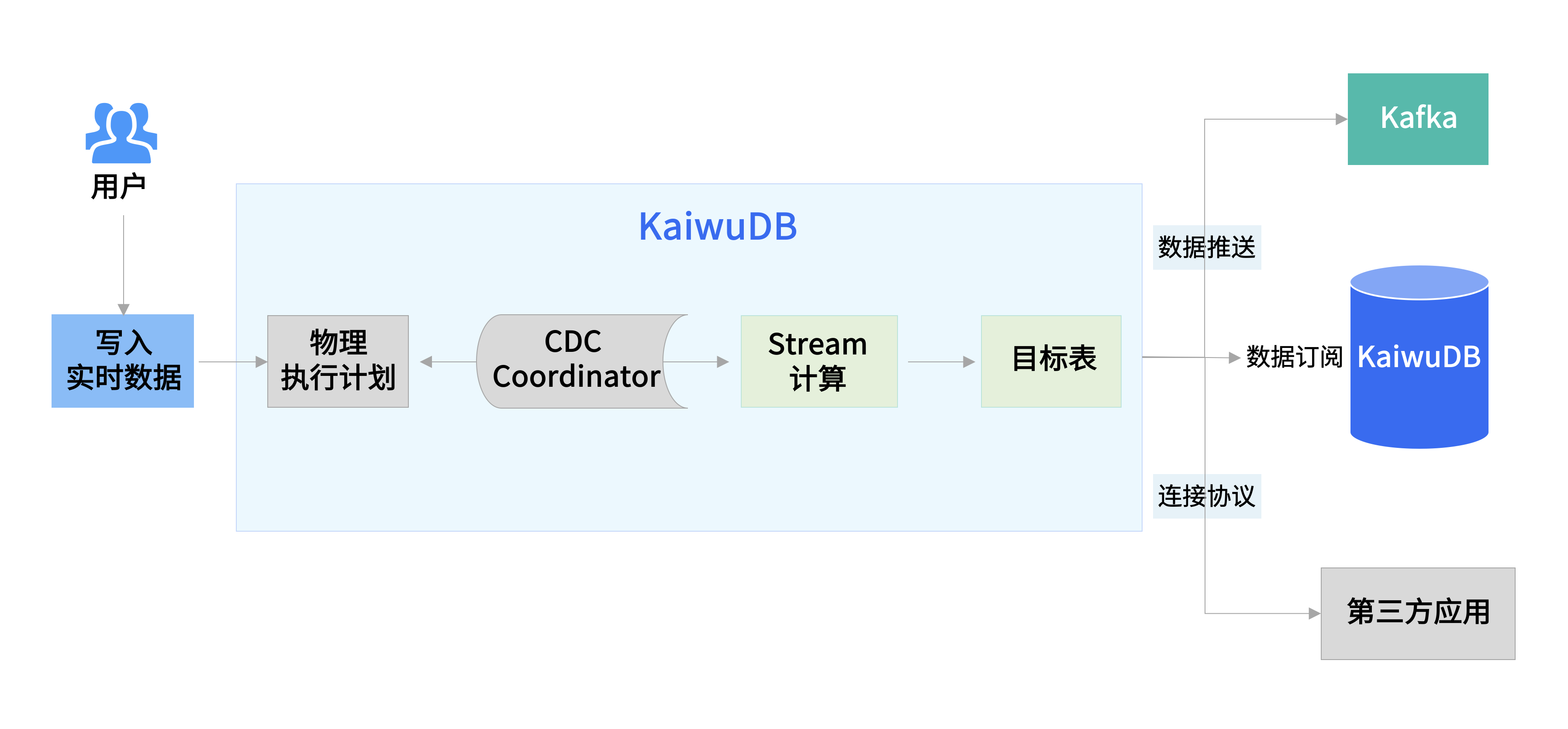 KaiwuDB 流计算功能使用变更数据捕获 (Change Data Capture, CDC) 机制实时捕获写入的时序数据,并使用 SQL 语句定义实时流变换。通过流计算,KaiwuDB V3.0 可实时捕获数据的细微变更,并迅速按照预先设定好的规则对数据进行预处理与分析,提升数据质量,节省存储计算资源,并支持秒级至毫秒级的业务决策。