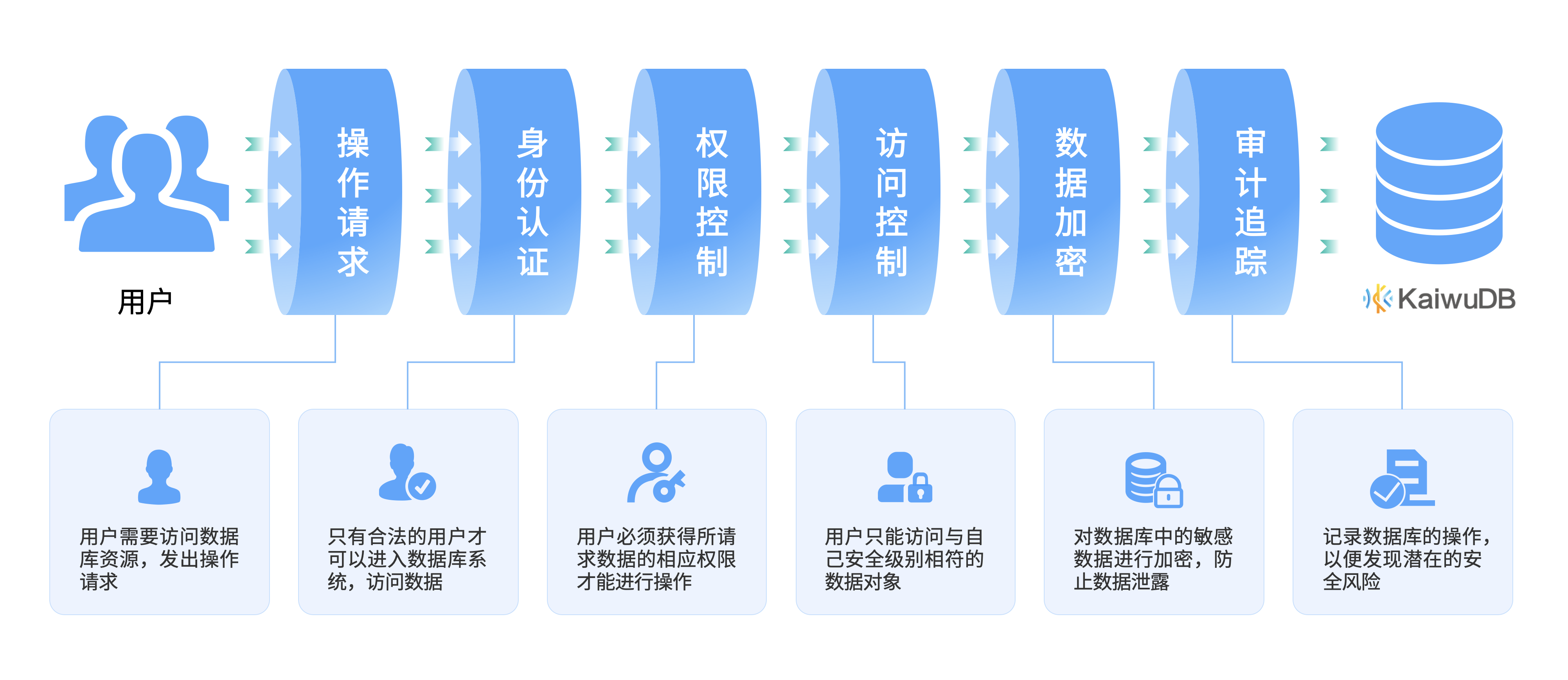 KaiwuDB V3.0 在原有用户权限管理、三权分立、数据传输加密、数据存储加密、安全审计等特性基础上,新增强制访问控制、非透明存储加密、国密算法支持、GSSAPI 第三方认证 等多重安全机制。同时强化口令策略 及 SQL 防注入能力,全面提升数据库访问、存储与传输的安全性。