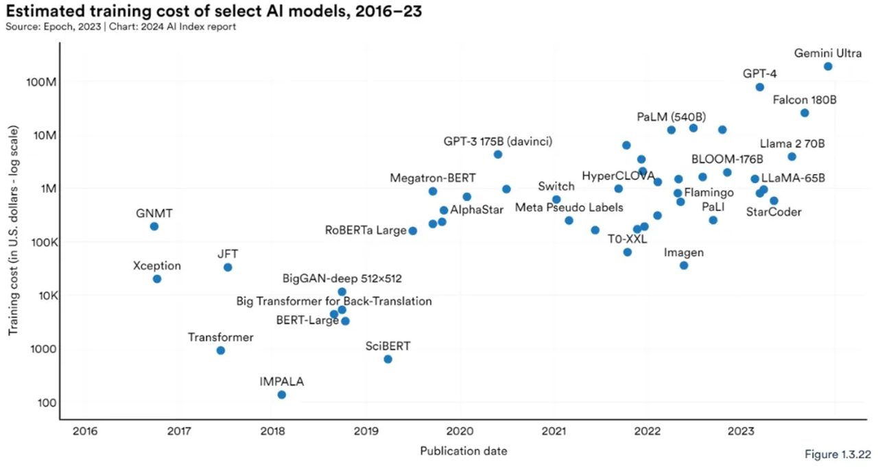 2016-2023 年部分人工智能模型训练成本估算(图片来源于网络)