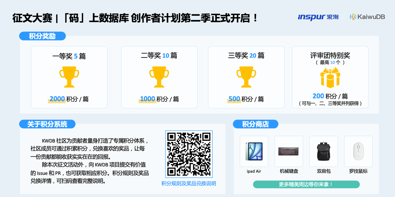 👉点击了解大赛详情 >>🔗征文大赛 |「码」上数据库 ------ KWDB 社区征文第二季启幕!