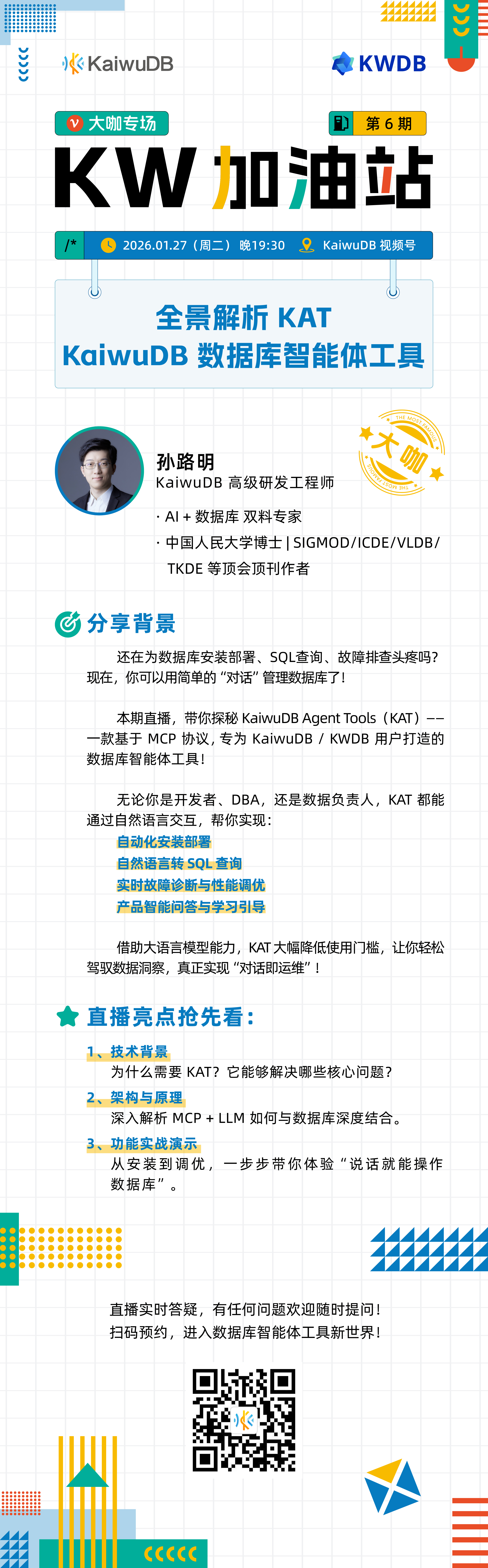 《KW 加油站》大咖专场第六期来啦🥳! 当 AI 真正“听懂”数据库:深度解析 KaiwuDB 智能体工具 KAT,开启“对话即运维”的新大门! 预约下方技术直播 解锁 KaiwuDB 新知识👇!