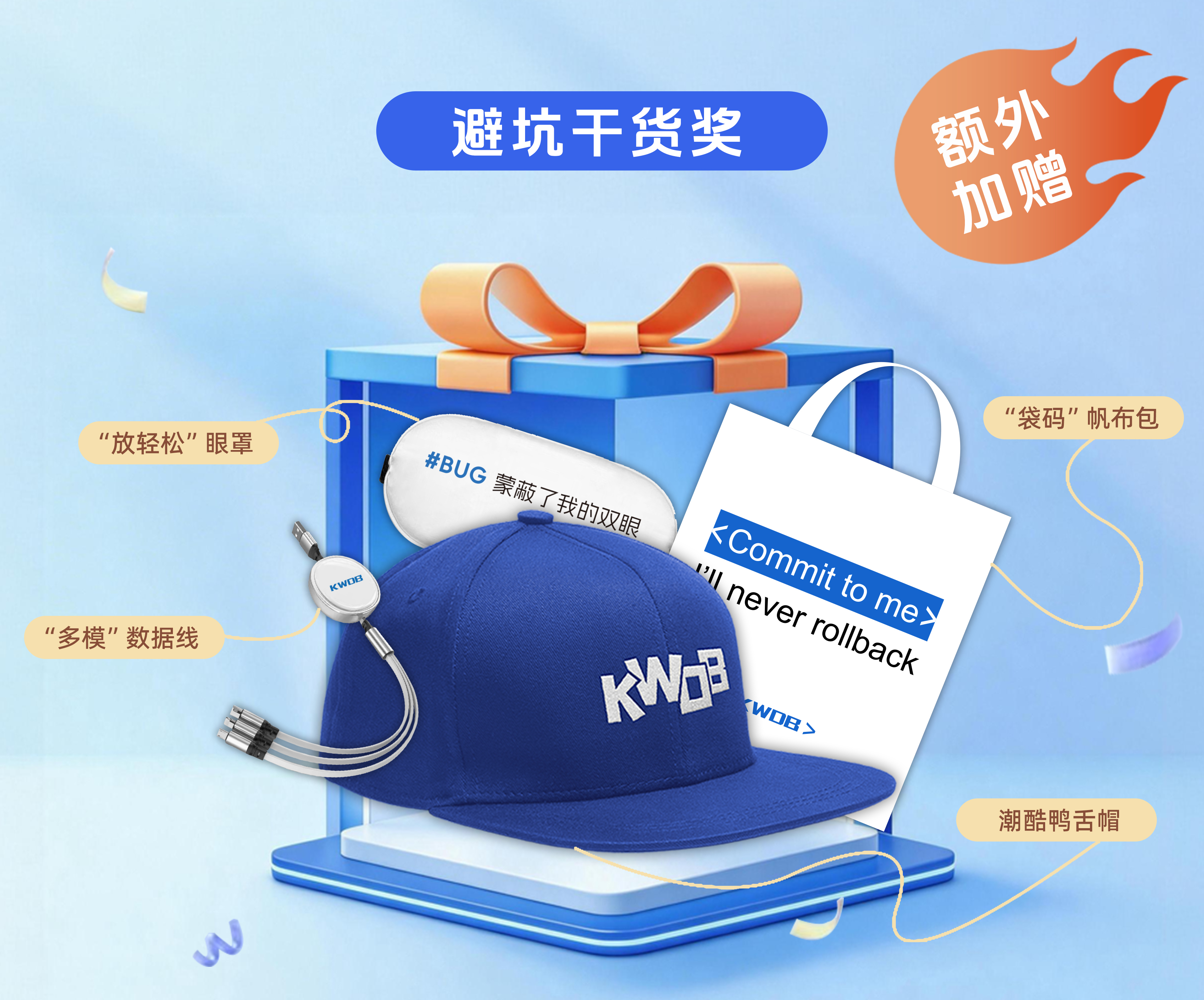 • KaiwuDB 社区定制帆布袋 1 个 + 鸭舌帽 1 个 + 眼罩 1 个 + 数据线 1 条